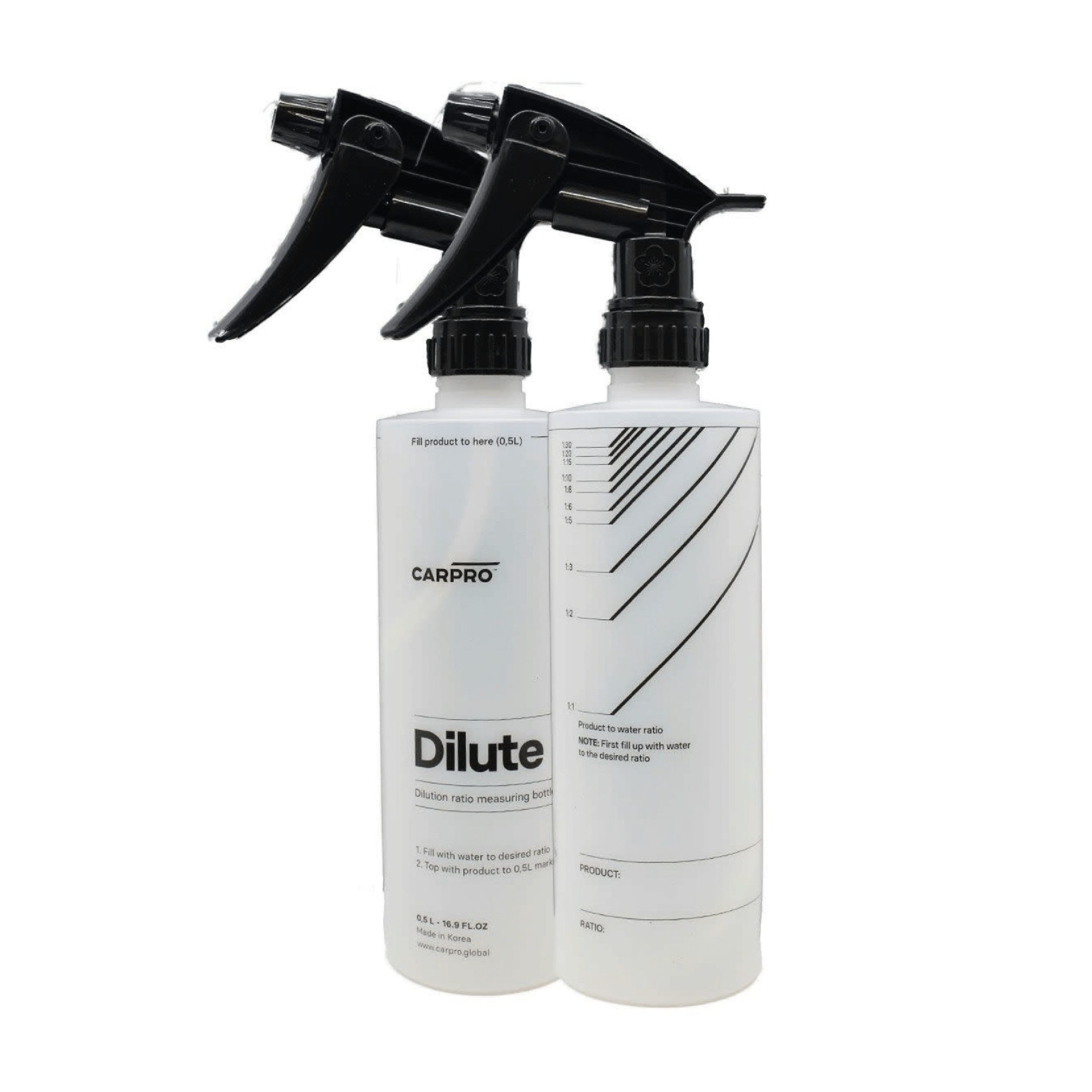 La botella Dilute tiene medidas de relación de dilución preimpresas adecuadas para todos sus productos CARPRO. Simplemente llene con agua hasta el marcador de relación de dilución deseado, luego rellene hasta la línea de llenado con el producto elegido y agítelo bien para mezclar.