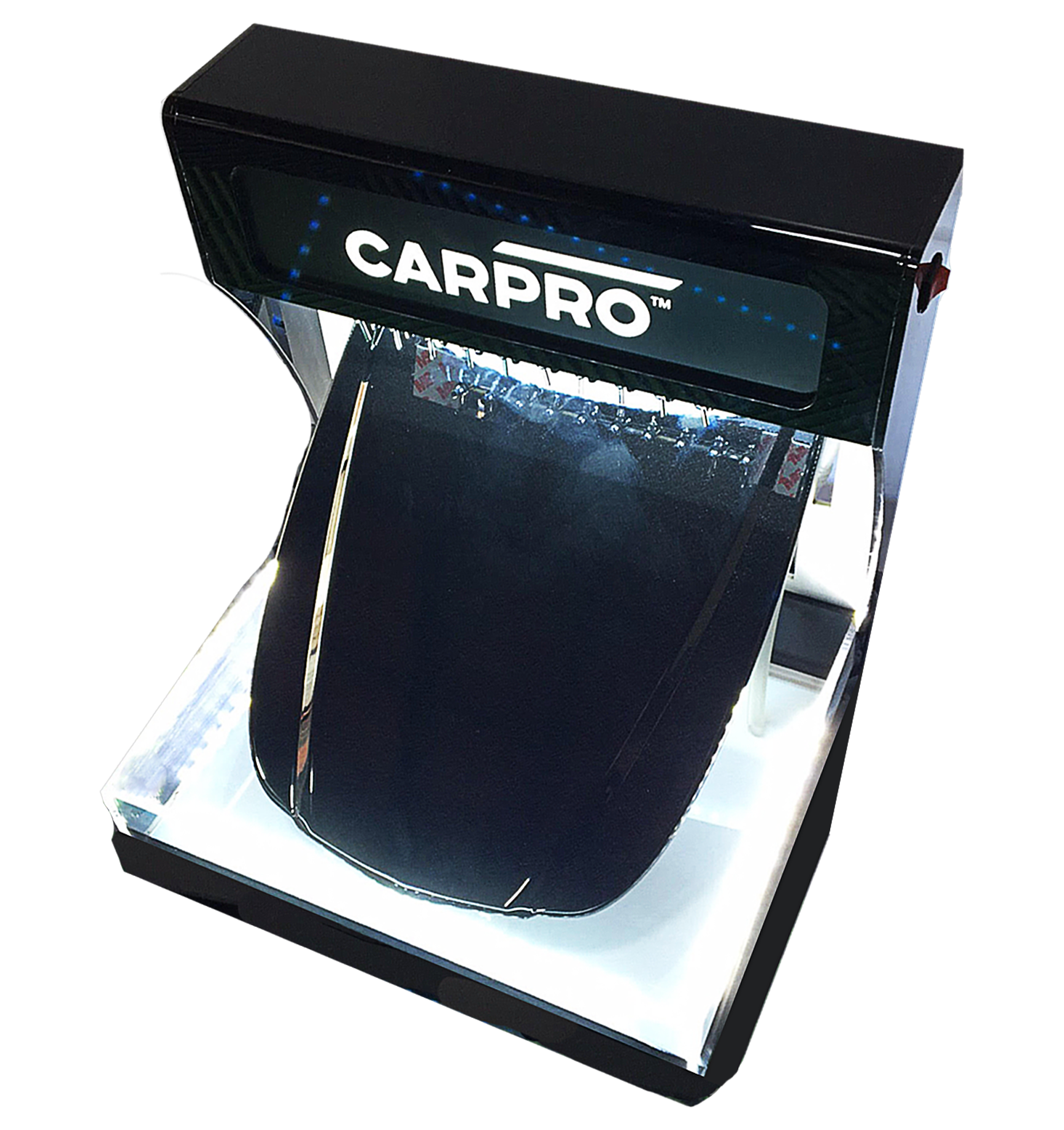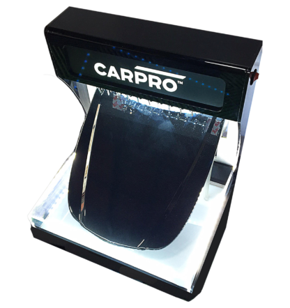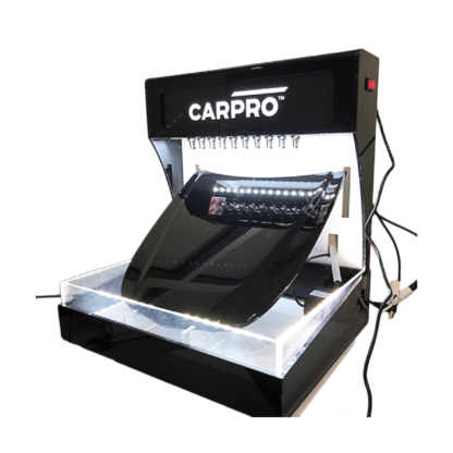 ¿Qué mejor manera de mostrar con orgullo los cerámicos CarPro y demostrar su rendimiento al cliente que con una mini capota de metal con pintura metálica negra y una sofisticada fuente de agua?