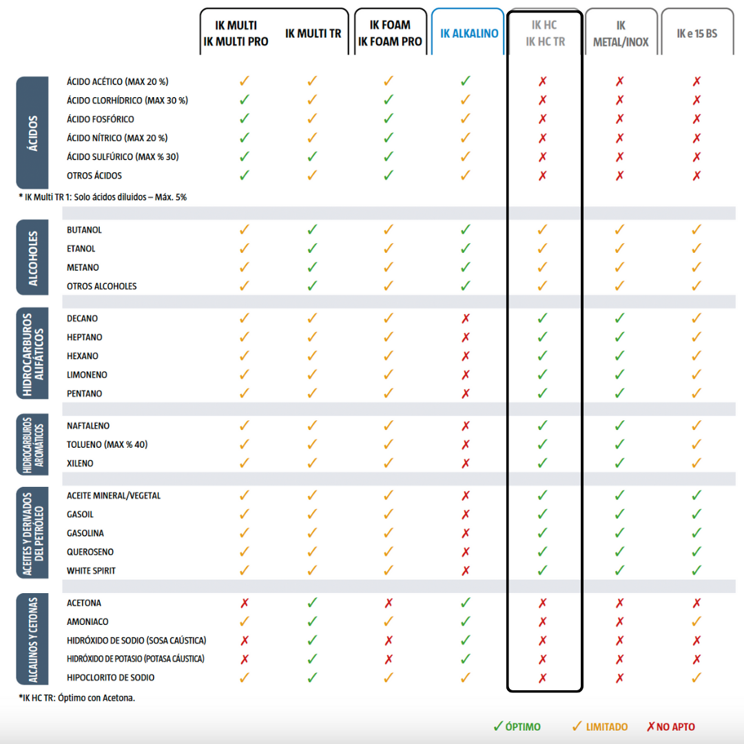 El pulverizador profesional IK HC 1.5 ha sido diseñado y fabricado con materiales de máxima resistencia para ser utilizado con aceites vegetales y animales, disolventes en base a hidrocarburos, lubricantes y derivados de petróleo.